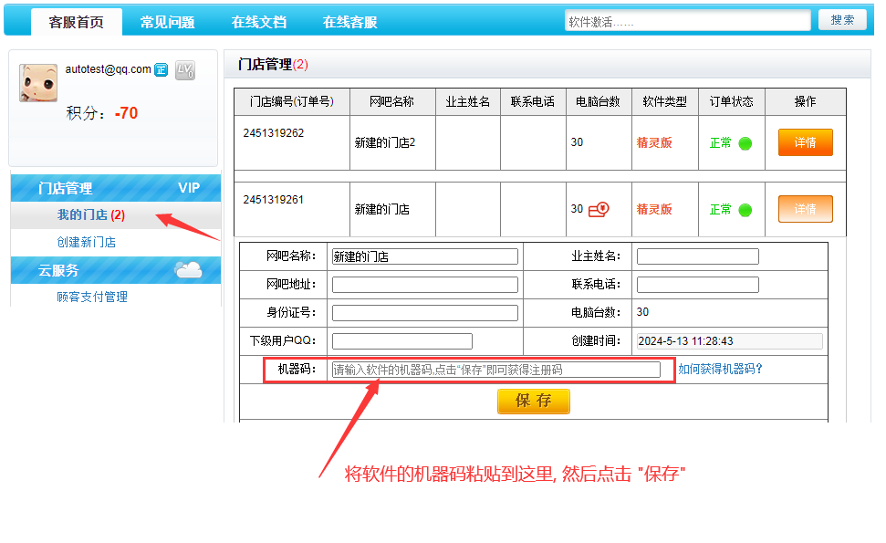 在官方网站www.u7pk.cn 登陆自己通行证, 在 "我的门店" 里选择这个网吧对应的空订单, 将机器码粘贴到如下图位置, 然后保存