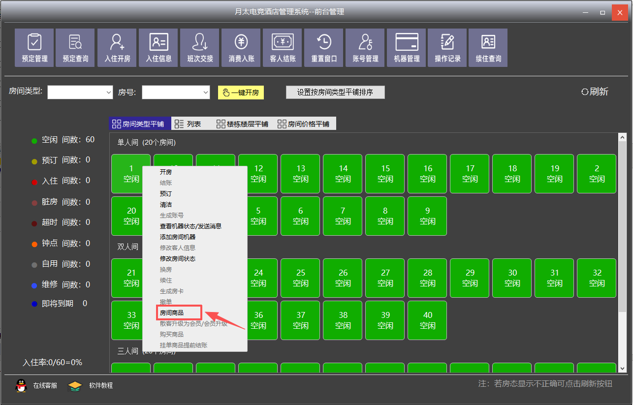 在前台管理界面 , 右键选择房间号---房间商品