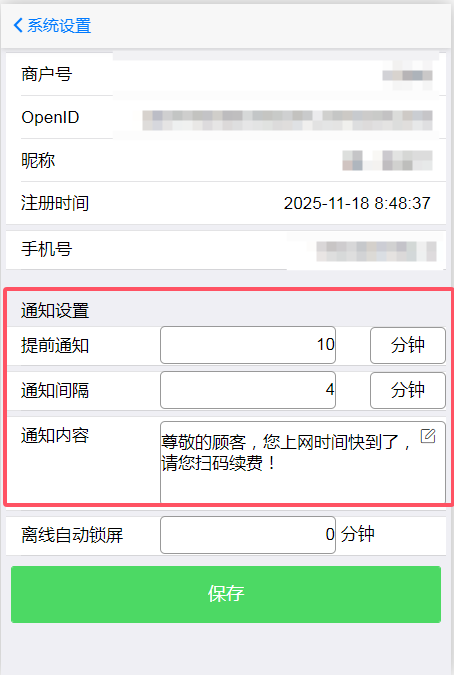 第一步 进入云蚂蚁后台 点右下角 设置—— 基本信息 即可设置剩余多少分钟提醒客人续费 和间隔多少分钟再次提醒 及提示短语
