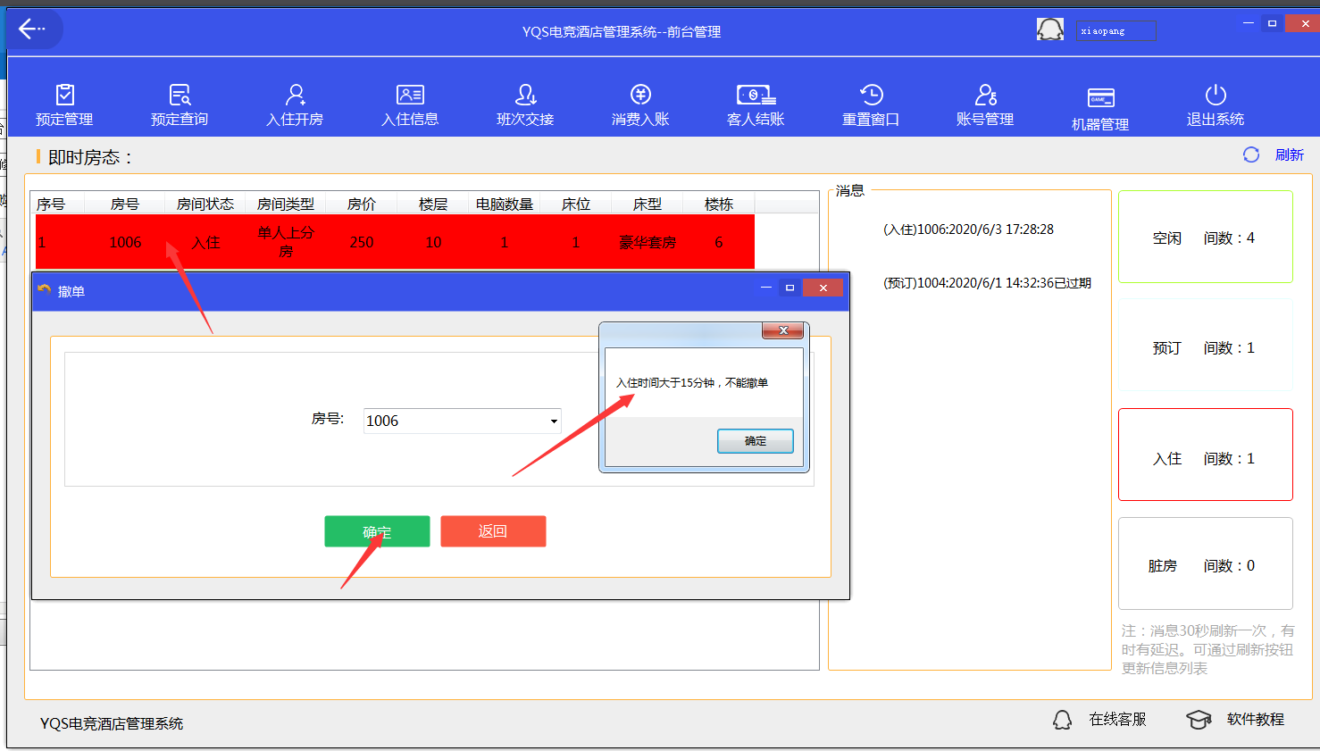 前台管理右键房间-->撤单,显示入住大于15分钟