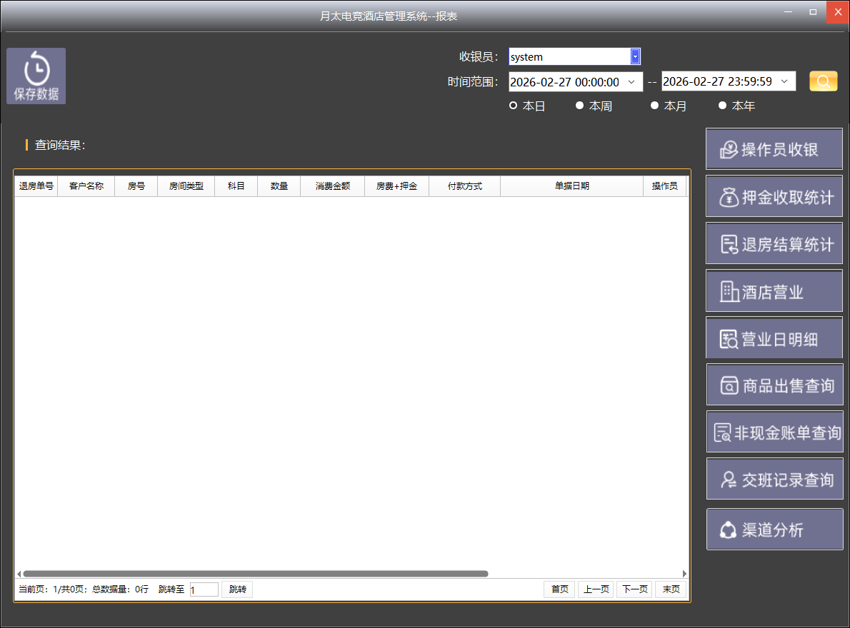 操作员收银、押金收取统计表、退房结算统计表、酒店营业、营业日明细、商品出售查询、非现金账单查询、交班记录查询、渠道分析