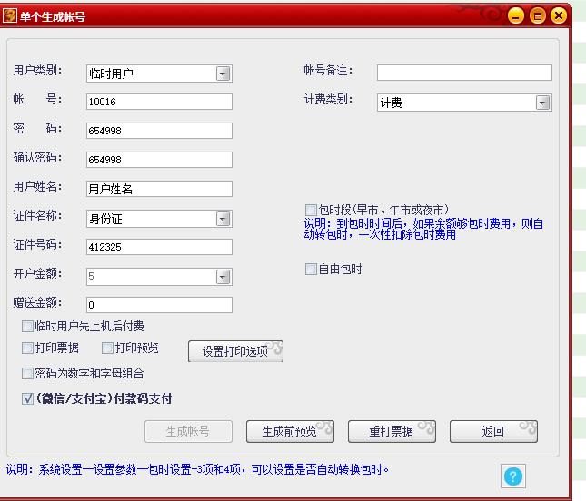 输入用户姓名、证件号码、开户金额(赠送金额如果设置会自动显示)、会员备注信息(QQ号码、联系电话等,可不填),最后点“生成帐号”按钮即可生成帐号。 如果外接有小票打印机可选中,选中打印后账号即可打印出来。