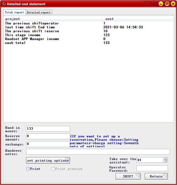 营业员交接班的时候可以点击系统界面的‘shift’营业交班,也可以点击日常管理的营业员交接班(When