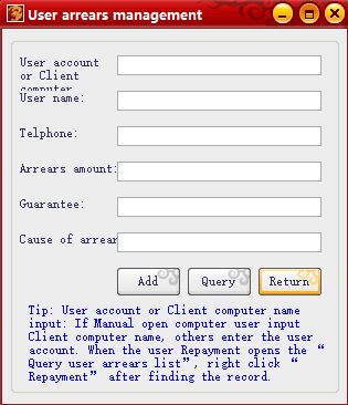点击这里可以添加或者查询用户欠账记录,即用户可以先上机,备注下来欠账记录之后以后把钱补上(Click here to add or check the user debt record, that is, the user can get on the machine first, note down the debt record and make up the money later